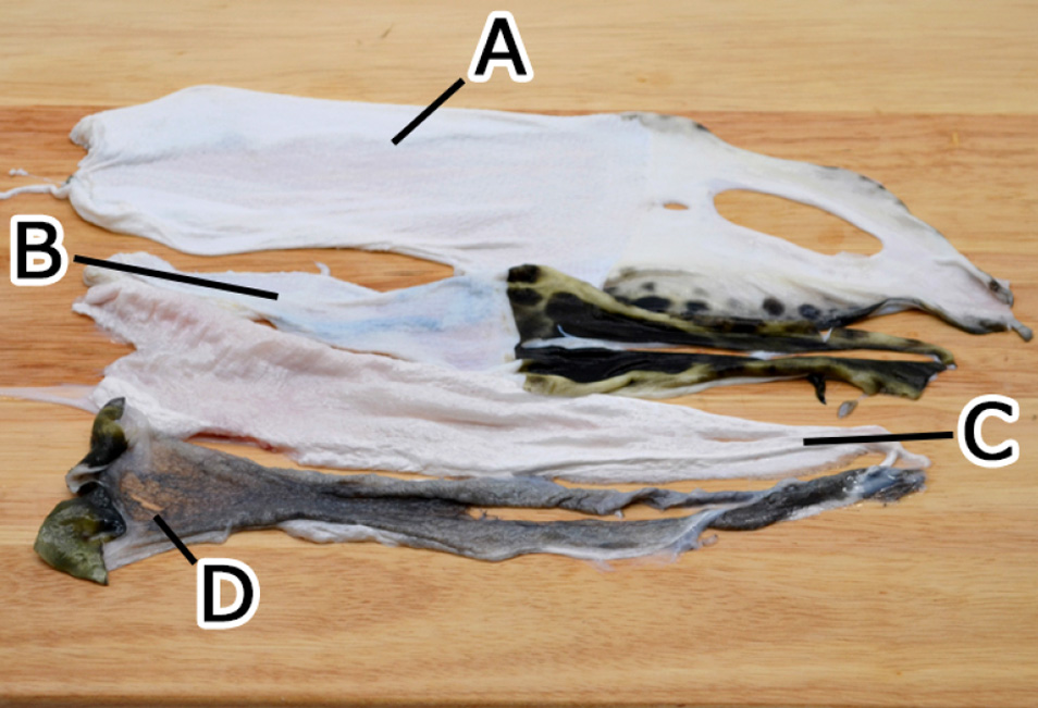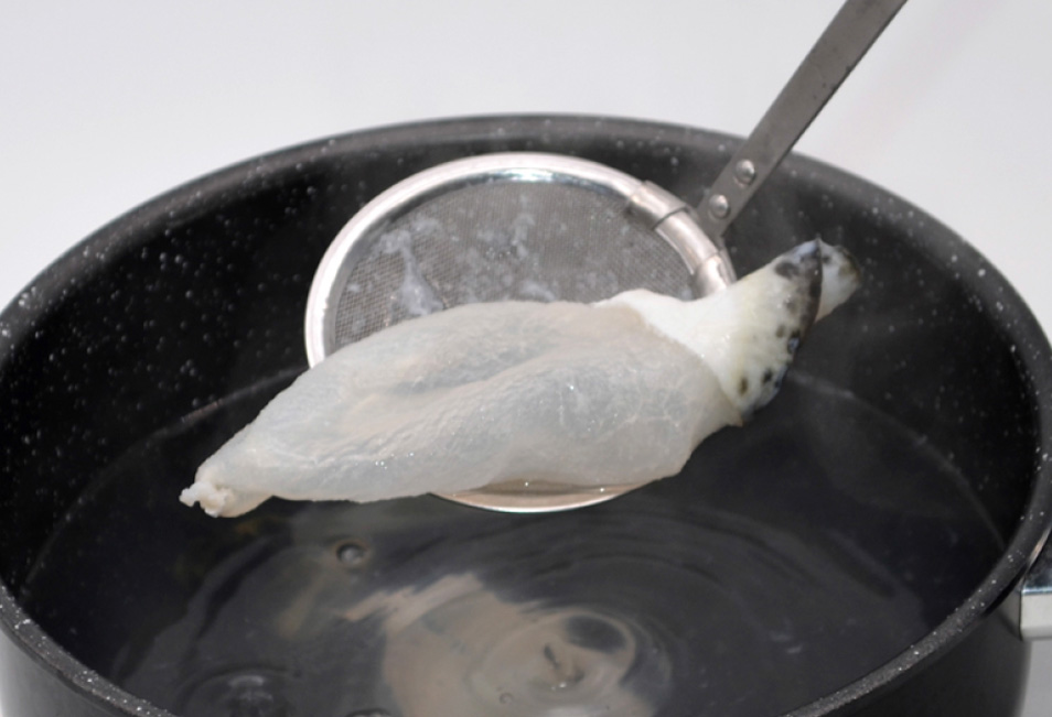 2.沸騰させたお湯で皮をゆがきます。A・B外皮は(5~10秒程度)透明になるまで、C・D内皮は(10秒~20秒)長めに