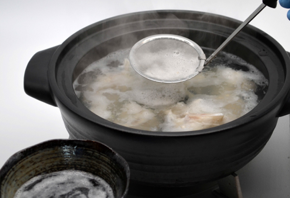 3.頭・カマ・口と塩を一つまみ入れて煮込み、アクを丁寧に取り除きます