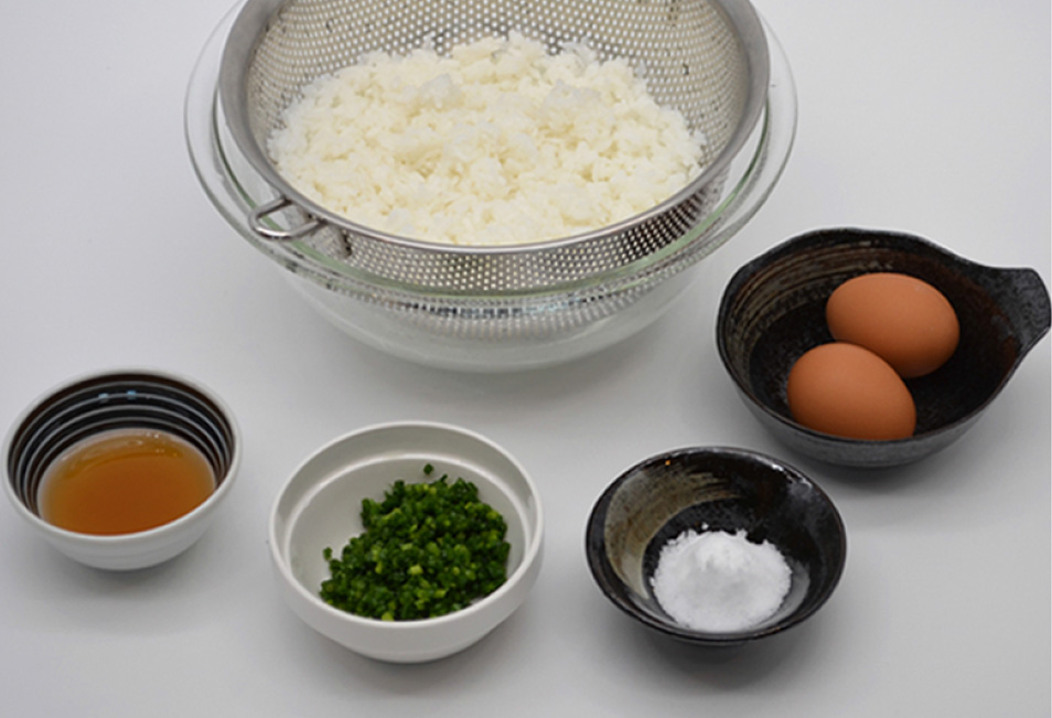 1.洗ったご飯と卵、塩、ネギ、醤油を用意します