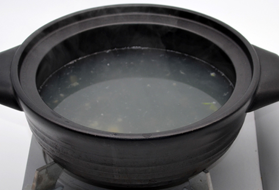 2.ふくチリの残りをすべて取り除き、沸騰させ塩を一つまみとご飯を入れます